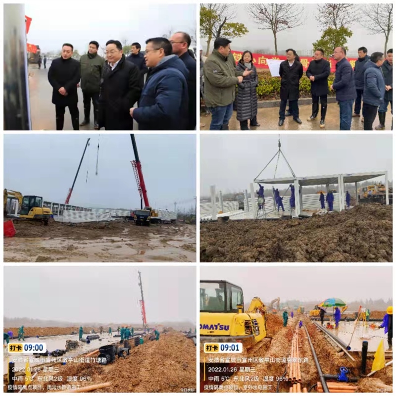 截止1月26日,現(xiàn)場已完成10000平方米混凝土硬化,雨污水管道、室外水電管道安裝進(jìn)展迅速,集裝箱板房開始拼裝。天氣惡劣、工期緊迫,一線人員努力克服各種困難和障礙,迎難而上。1月25日下午,區(qū)政府召開宣州區(qū)新冠肺炎疫情防控工作專題會議,審定了隔離點(diǎn)項(xiàng)目方案,明確了相關(guān)事項(xiàng),會議對施工進(jìn)度和現(xiàn)場管理給予了充分的肯定,同時(shí)也要求在嚴(yán)把工程質(zhì)量關(guān)和隔離點(diǎn)各項(xiàng)要求的基礎(chǔ)上,倒排工期,加快施工,確保早日交付使用。