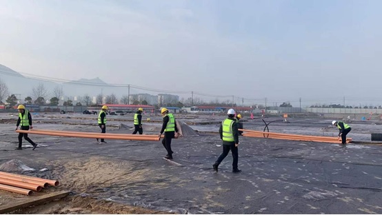 年三十,混凝土初凝,均在養(yǎng)護(hù)期內(nèi),吊裝設(shè)備雖不能進(jìn)場(chǎng),但項(xiàng)目建設(shè)進(jìn)度絲毫沒有懈怠。參建各方組織力量,搶抓能夠施工的地方,項(xiàng)目管理人員放棄節(jié)假日奔赴現(xiàn)場(chǎng)指導(dǎo)施工,水電班組全員到崗鋪設(shè)水電管道,為下一步準(zhǔn)備區(qū)、緩沖區(qū)的板房安裝及隔離區(qū)的打包房安裝做好充足的準(zhǔn)備工作。